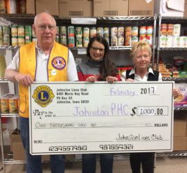 Club president Mike Beaman presents $1000 to Johnston Partnership for a Healthy Community’s Andrea Cook, at the Partnership food pantry. Also pictured is Lion Judy Anderson who serves on the Partnership Board.